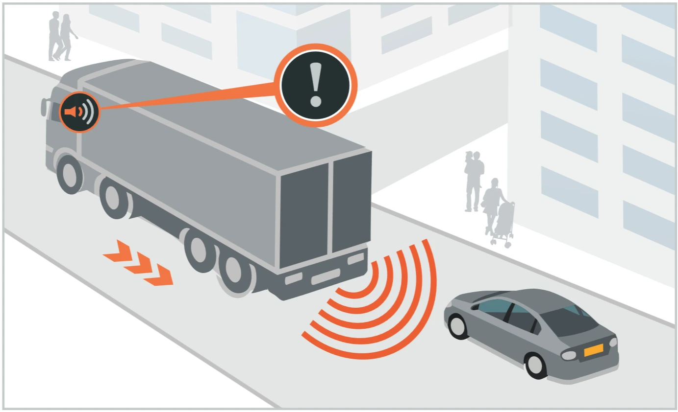 If an obstacle is detected during reversing, the driver receives an initial audible and visual alert through the in-cab sounder and display. This gives the driver early warning while there is still distance to react.